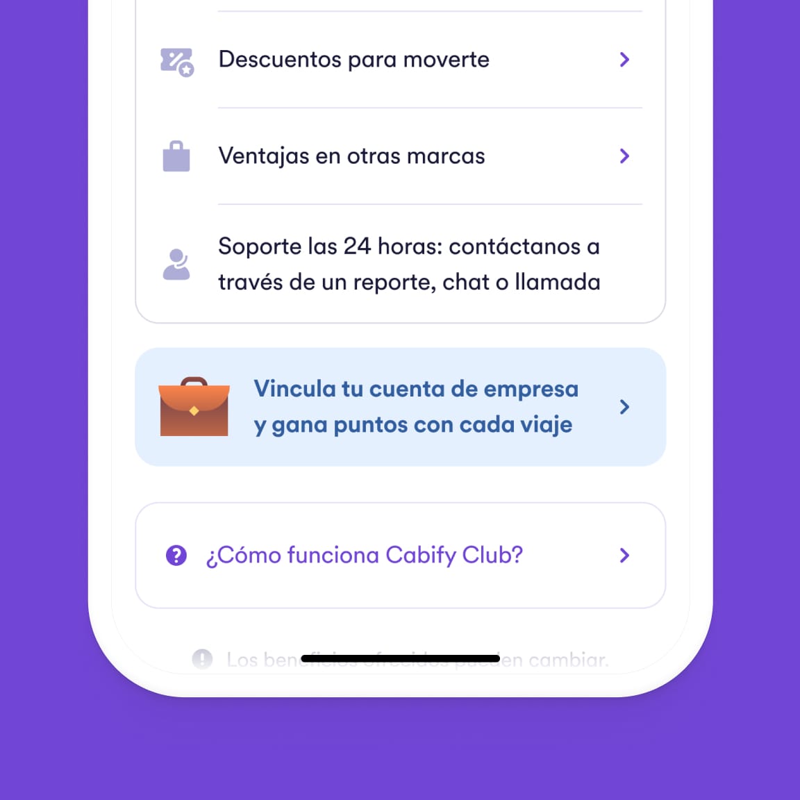 Para conocer los beneficios de tu nivel, ve a la sección ‘Cabify Club’ dentro del menú de tu app.